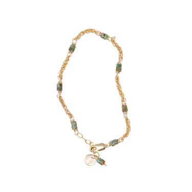 The Carlisle bracelet artfully combines a delicate rope chain with cylindrical turquoise stones in a rich green hue or soft white pearls for a dressier touch. Its design exudes elegance and offers a striking blend of sophistication and natural beauty.