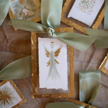 Each ornament is hand painted in watercolor with gold leaf details upon an acrylic base.
