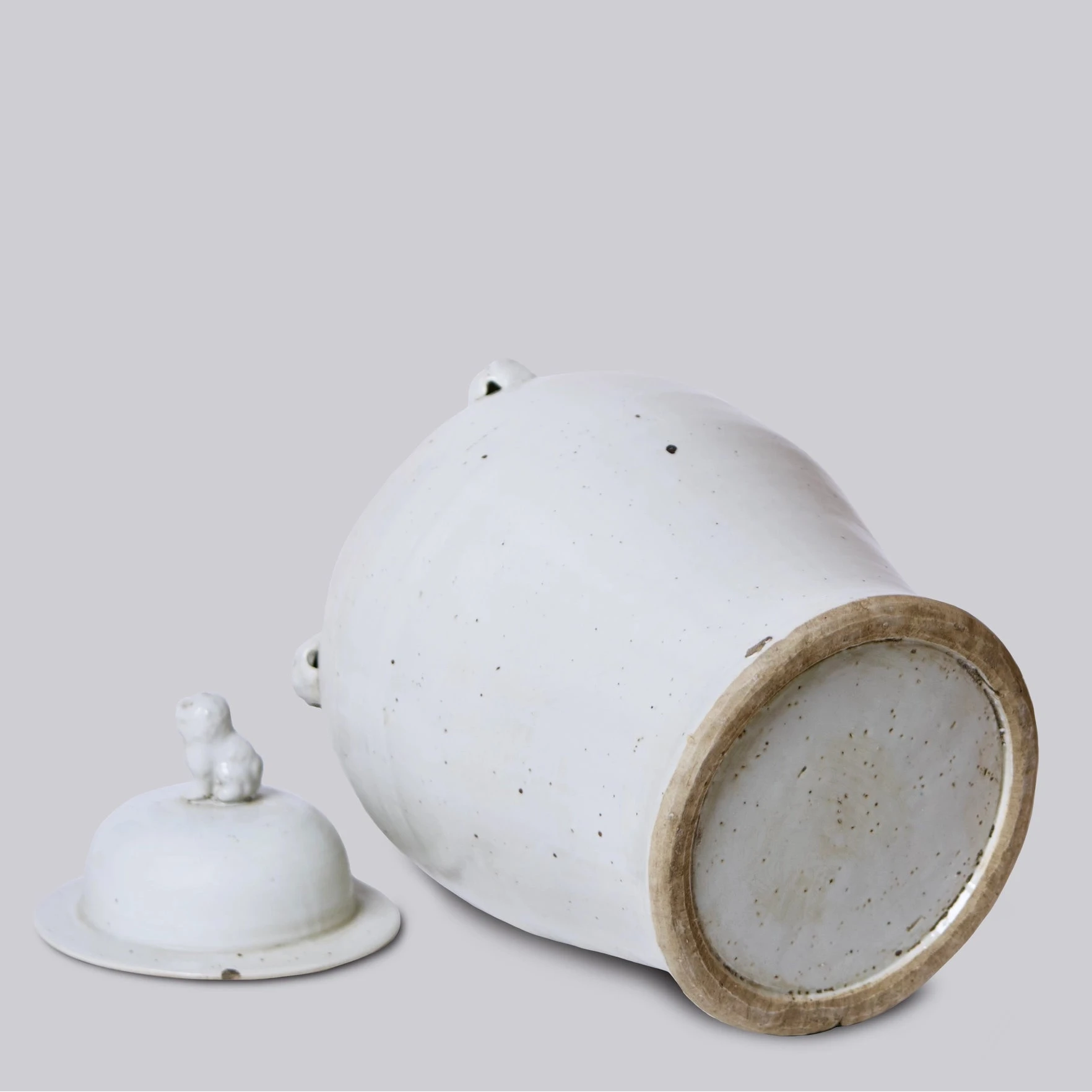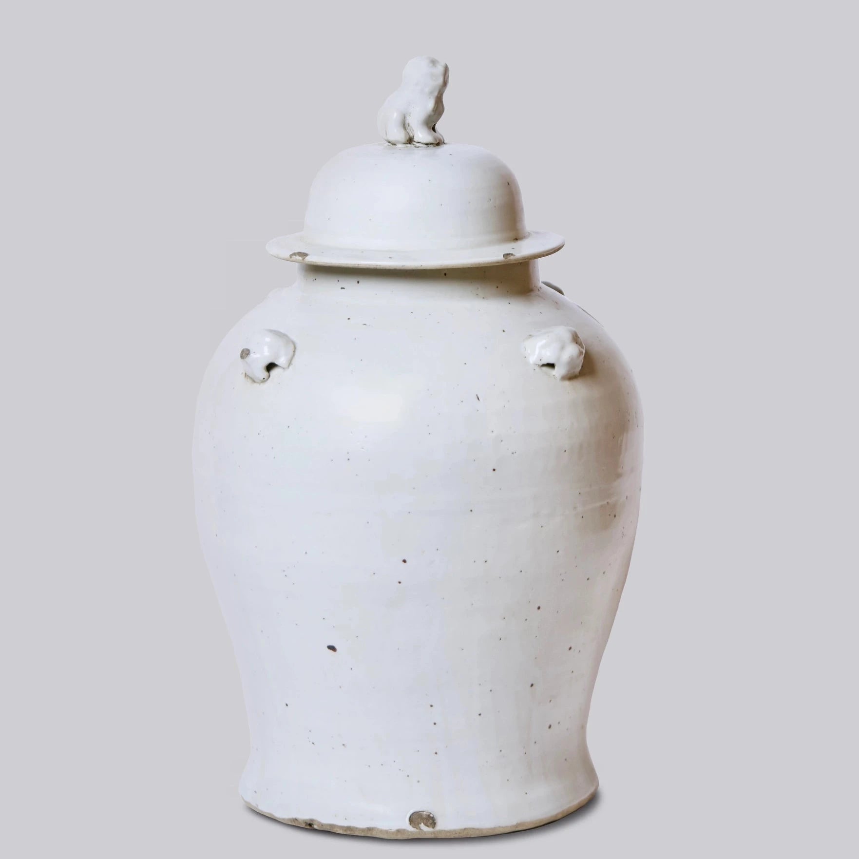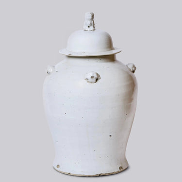 This Rustic White Temple Jar feels like a piece that’s been passed down and perfectly loved over time. The matte porcelain finish and subtle distressing make it easy to mix into any décor style, from farmhouse to modern. Lovely displayed on its own or filled with fresh greenery. This Temple Jar vessel is from the antiques markets of Jingdezhen, a town long distinguished by imperial patronage. This piece is a wheel thrown rustic porcelain pot with unique handmade look, 12” x 19”