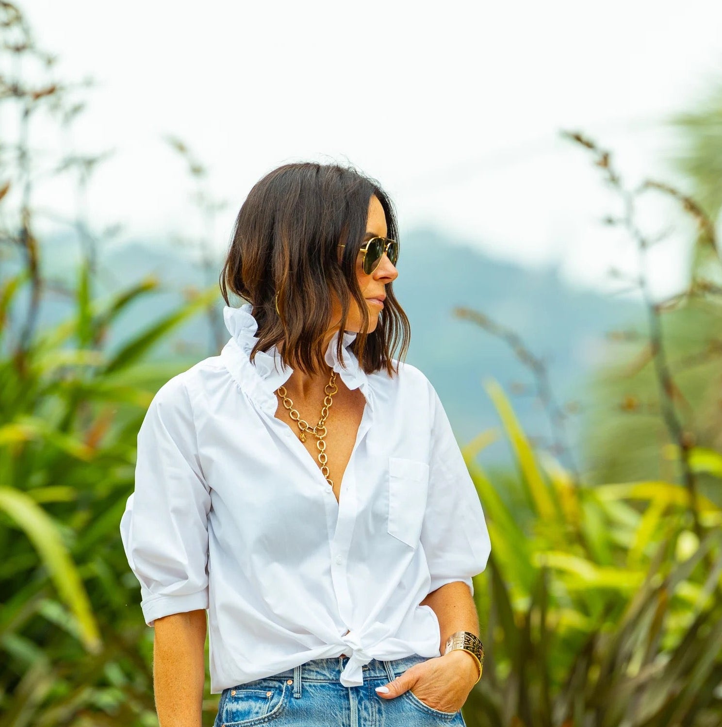 - Wear it buttoned down for a relaxed vibe, neatly tucked in, tied at the bottom, or showcase the iconic KMJ (cross) tuck.