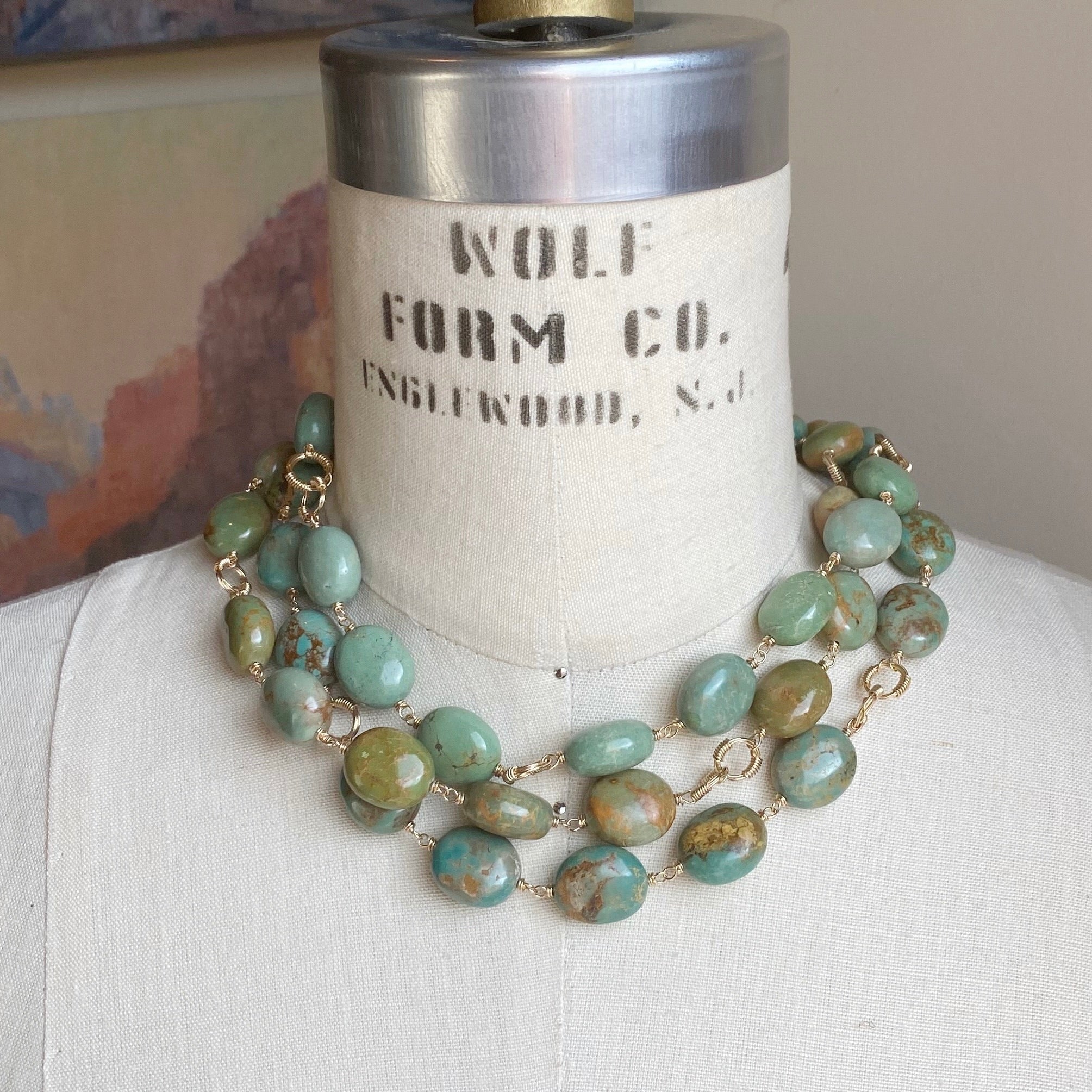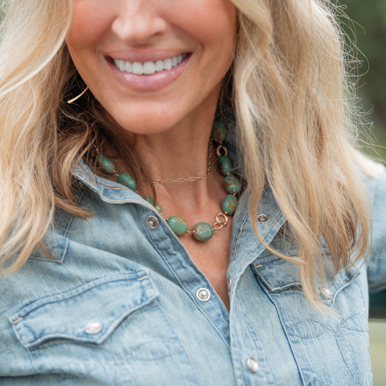 This necklace strikes a perfect balance between classic elegance and bold design. Its large turquoise stones command attention with their generous size, while the understated green hues lend a soft, subtle sophistication. The muted tones of the turquoise create a refined, timeless look, allowing the boldness of the piece to shine without overpowering.
