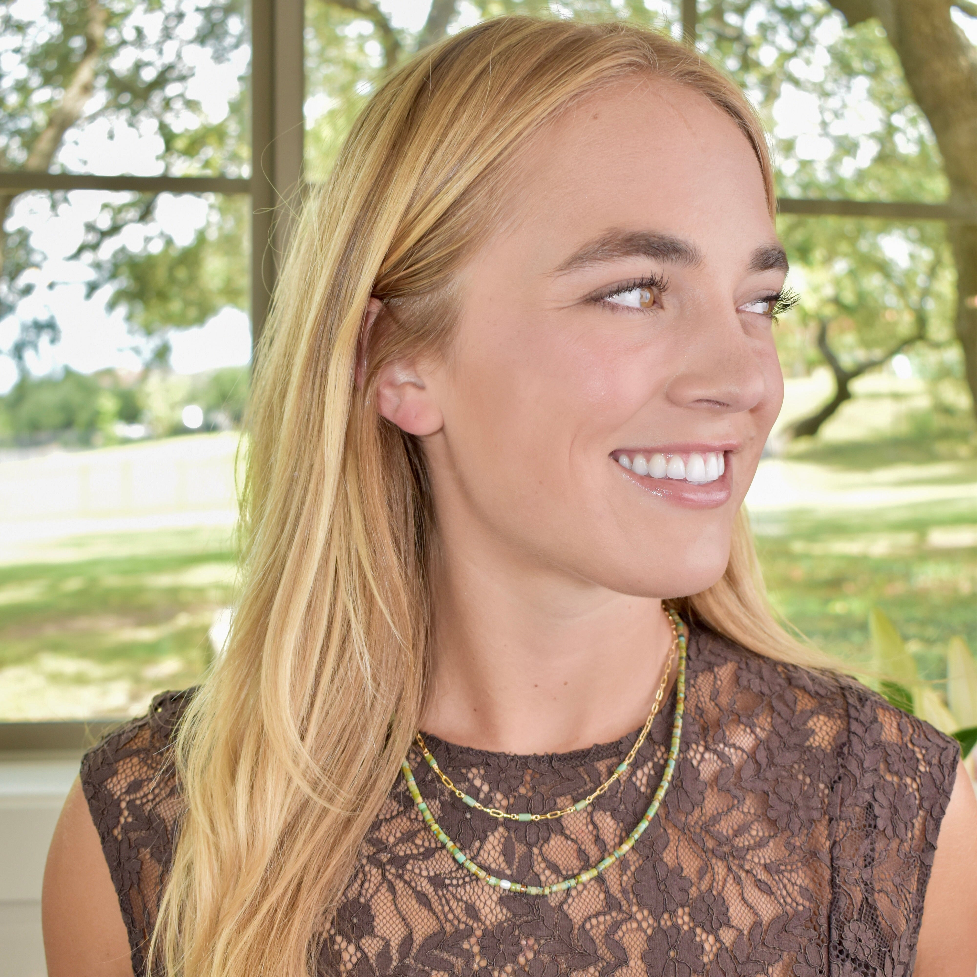 The Clark necklace blends strength with subtle charm. Five rich green turquoise stones are thoughtfully spaced along a delicate paperclip chain, creating a design that feels both modern and timeless—dainty, yet durable.