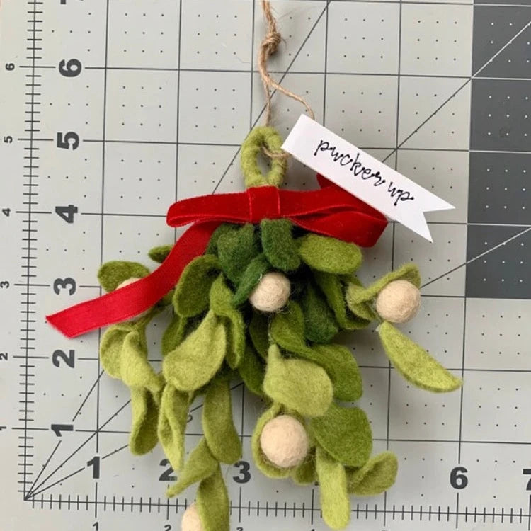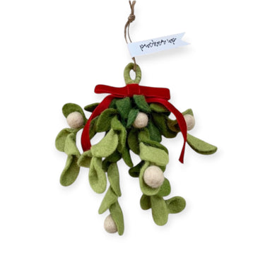 This sweet mistletoe measures approximately 6” from top to bottom and is topped with a festive red velvet ribbon and a paper tag that says “pucker up”. A Johnny and James best-seller every year! Customers love hanging this cutie up year after year.