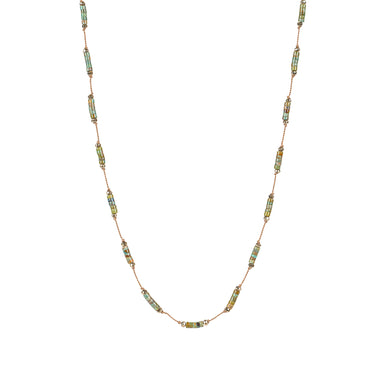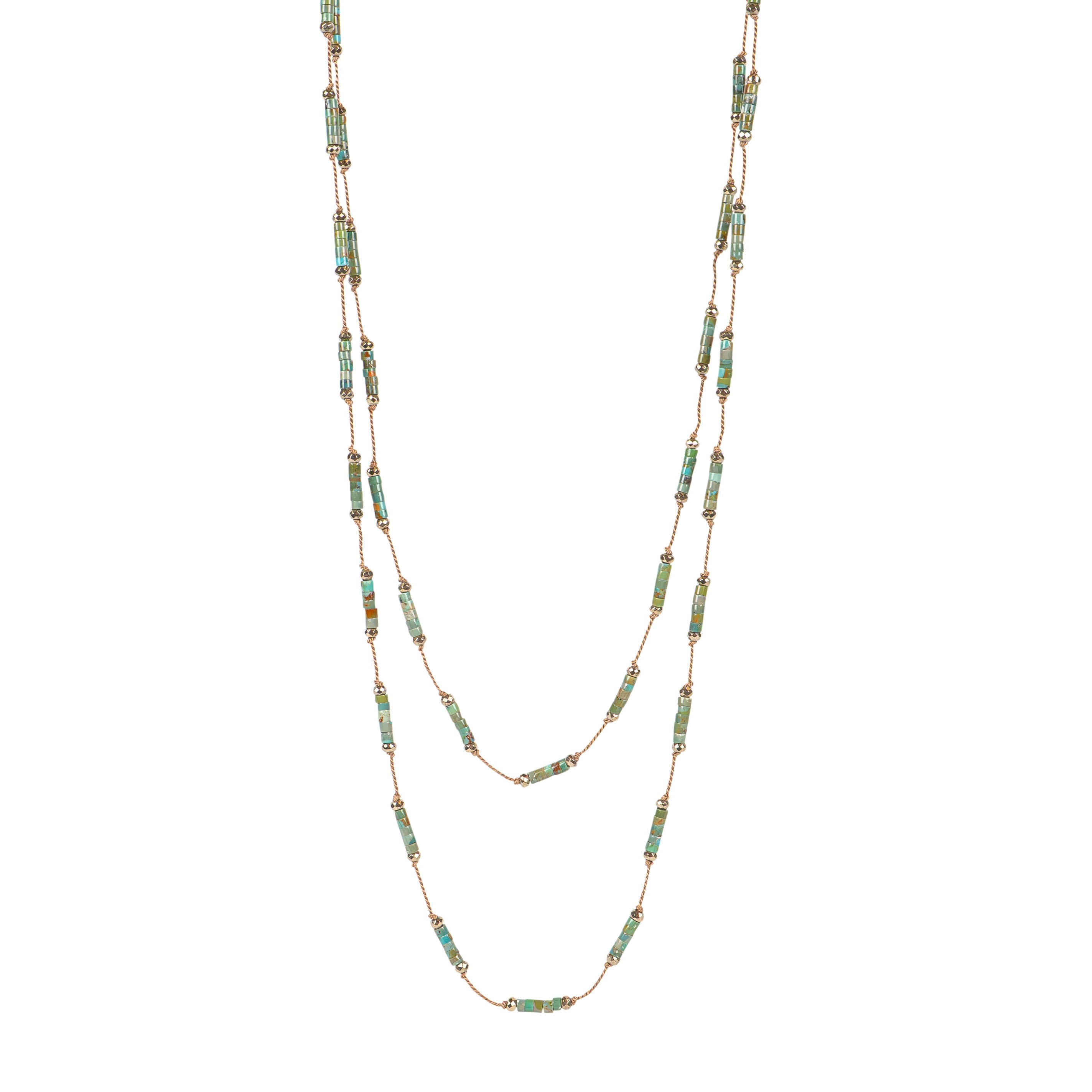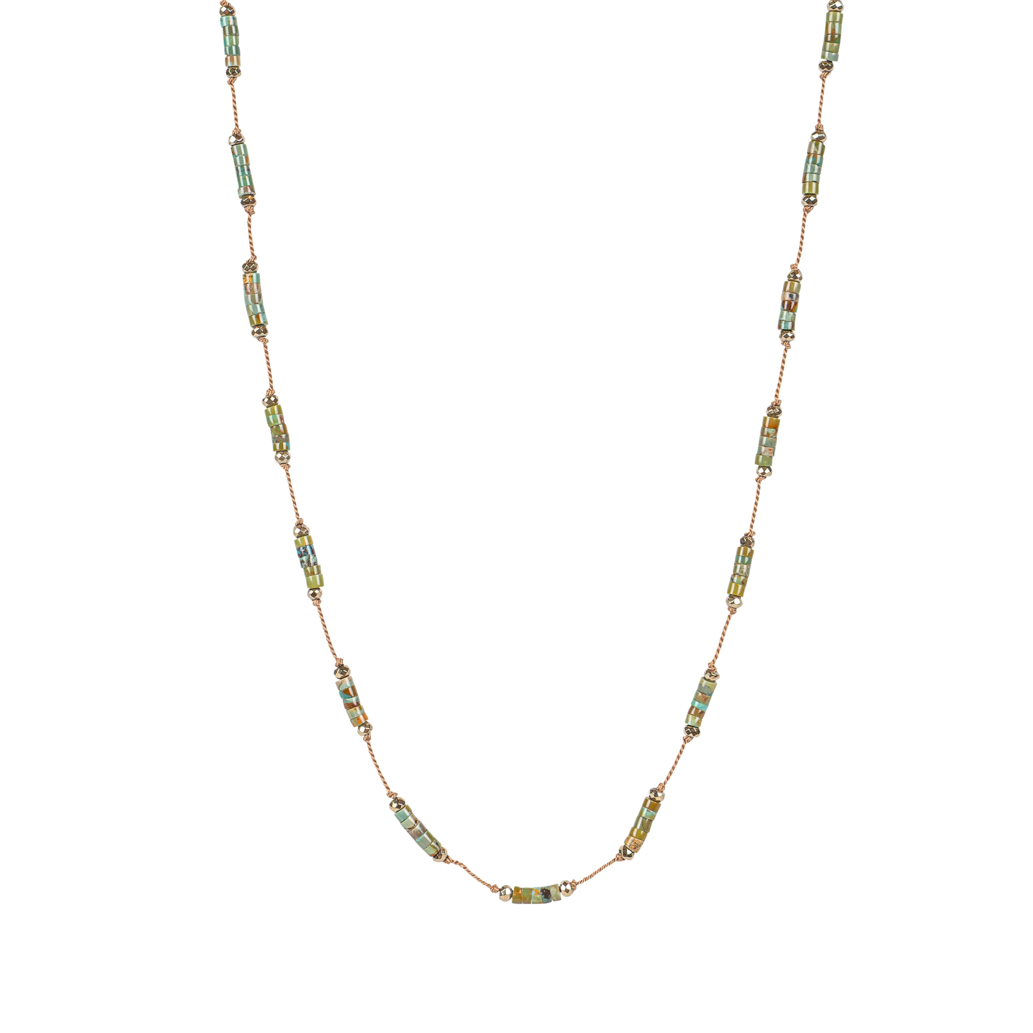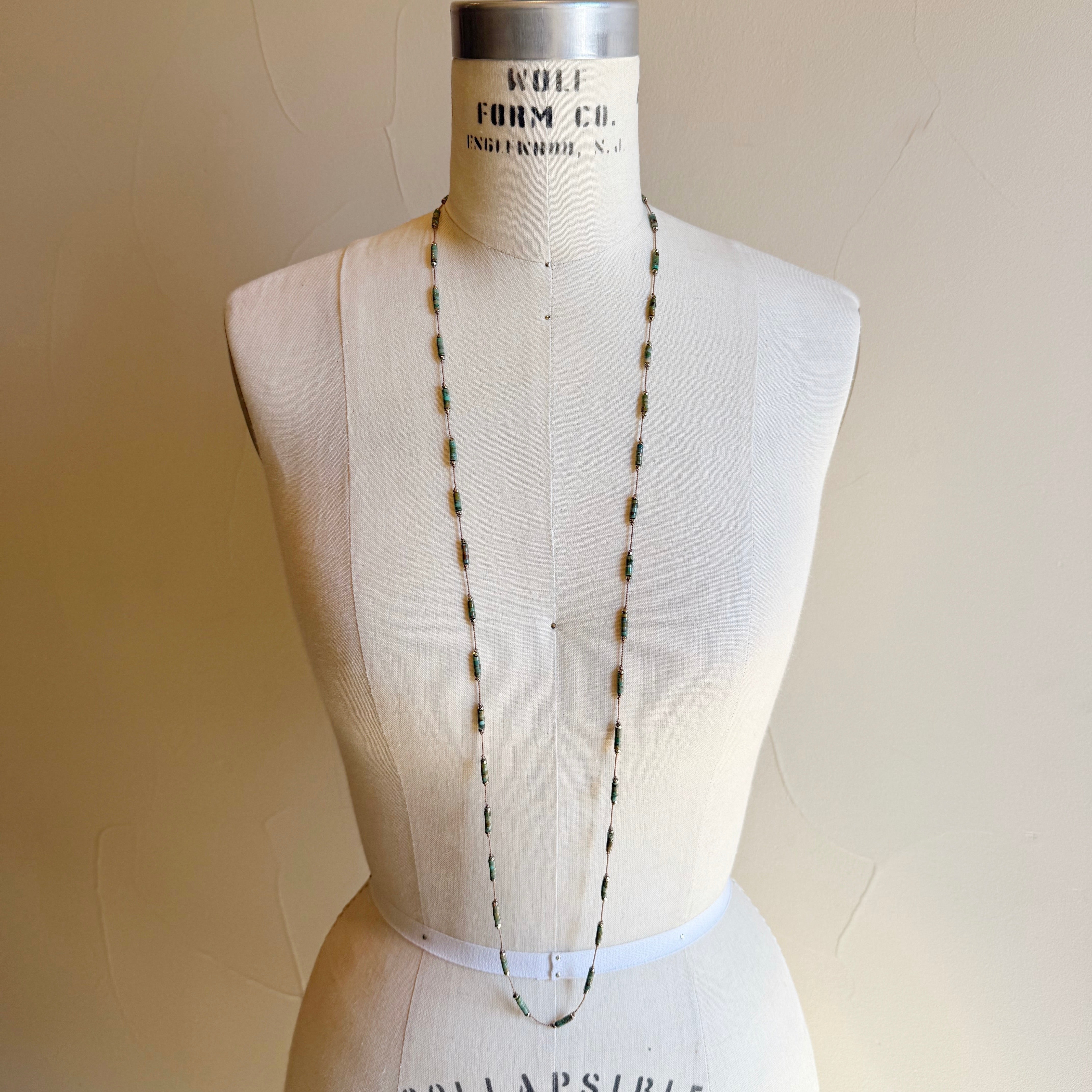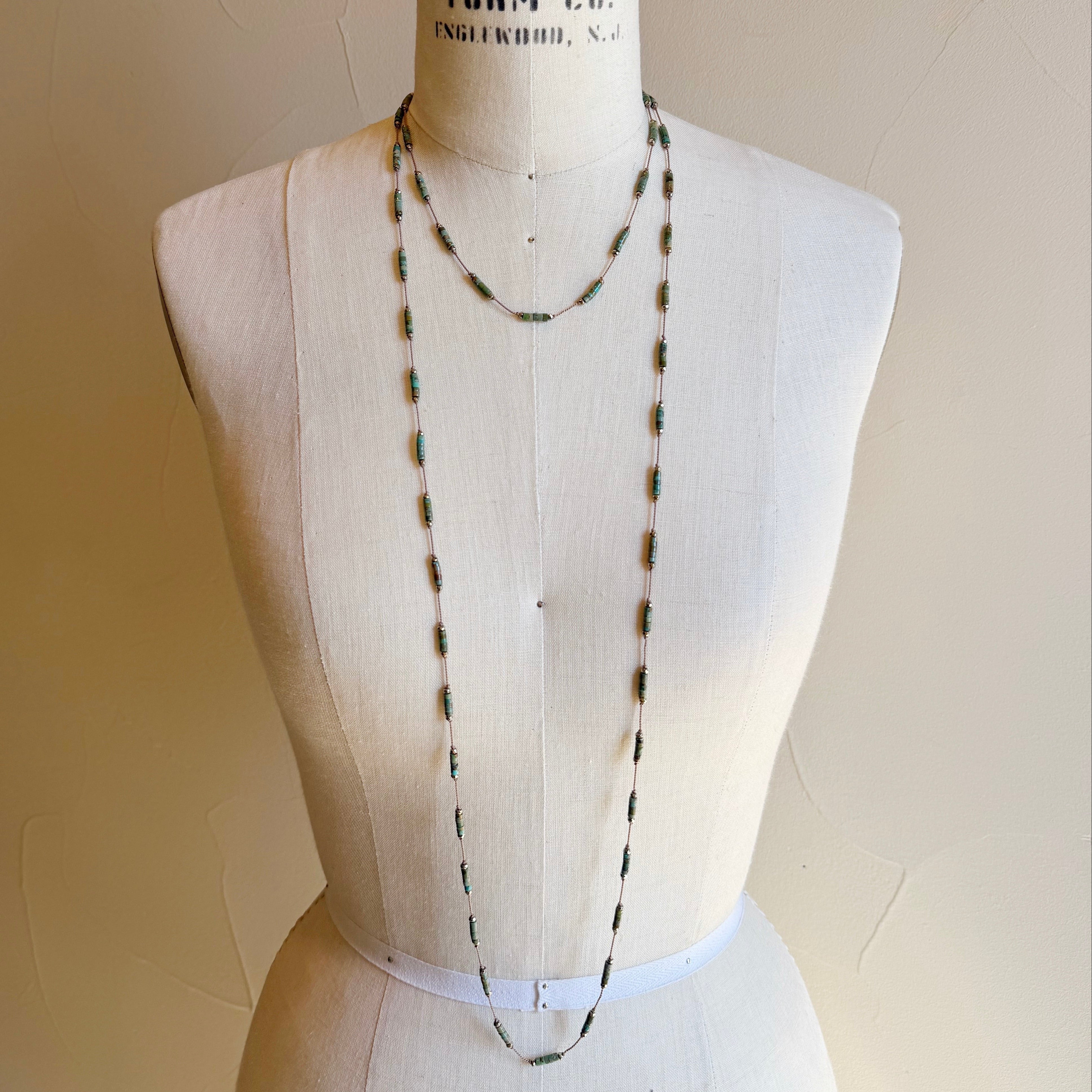 The Johnny Necklace, offered in 2 lengths, is light and airy with just the right amount of sparkle. The muted green turquoise is perfect for fall fashion while the shiny pyrite stones make this necklace pop! Hand-knotted on silk cord making a statement on its own.
