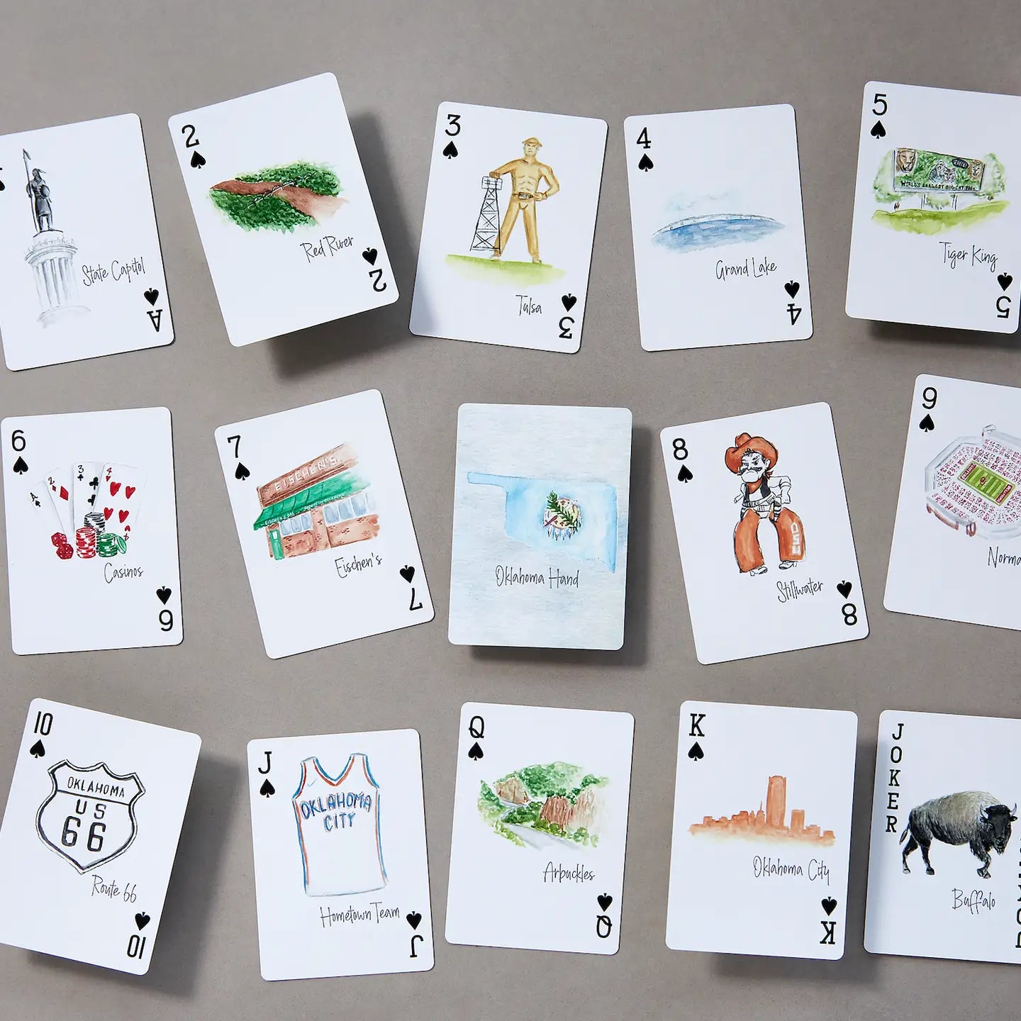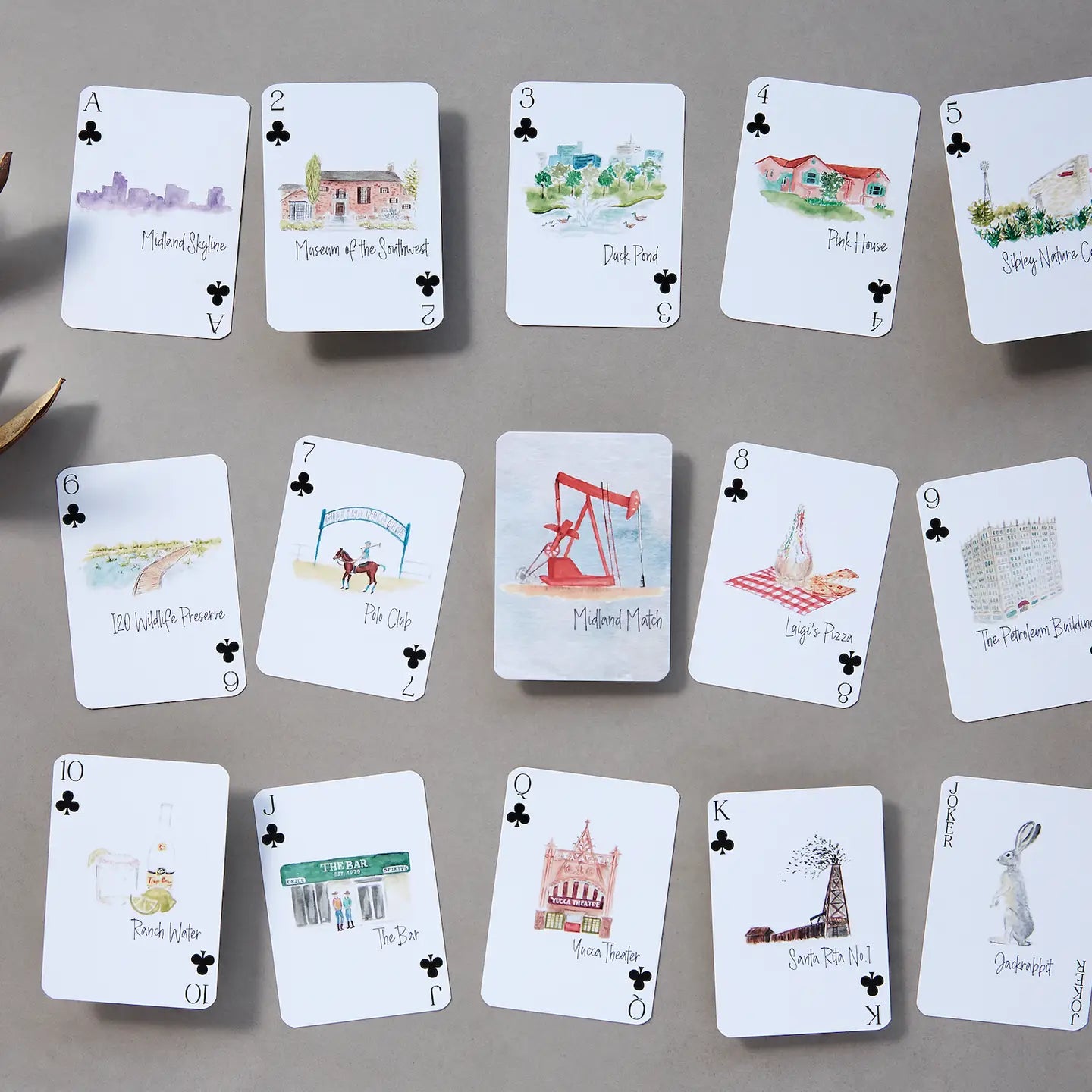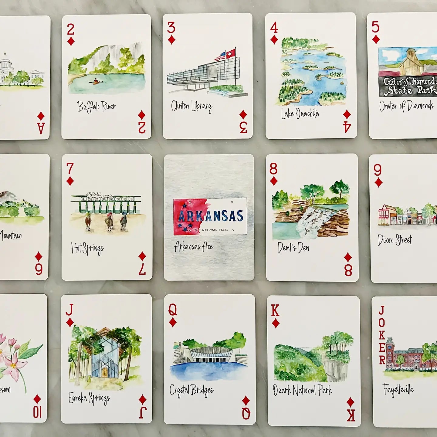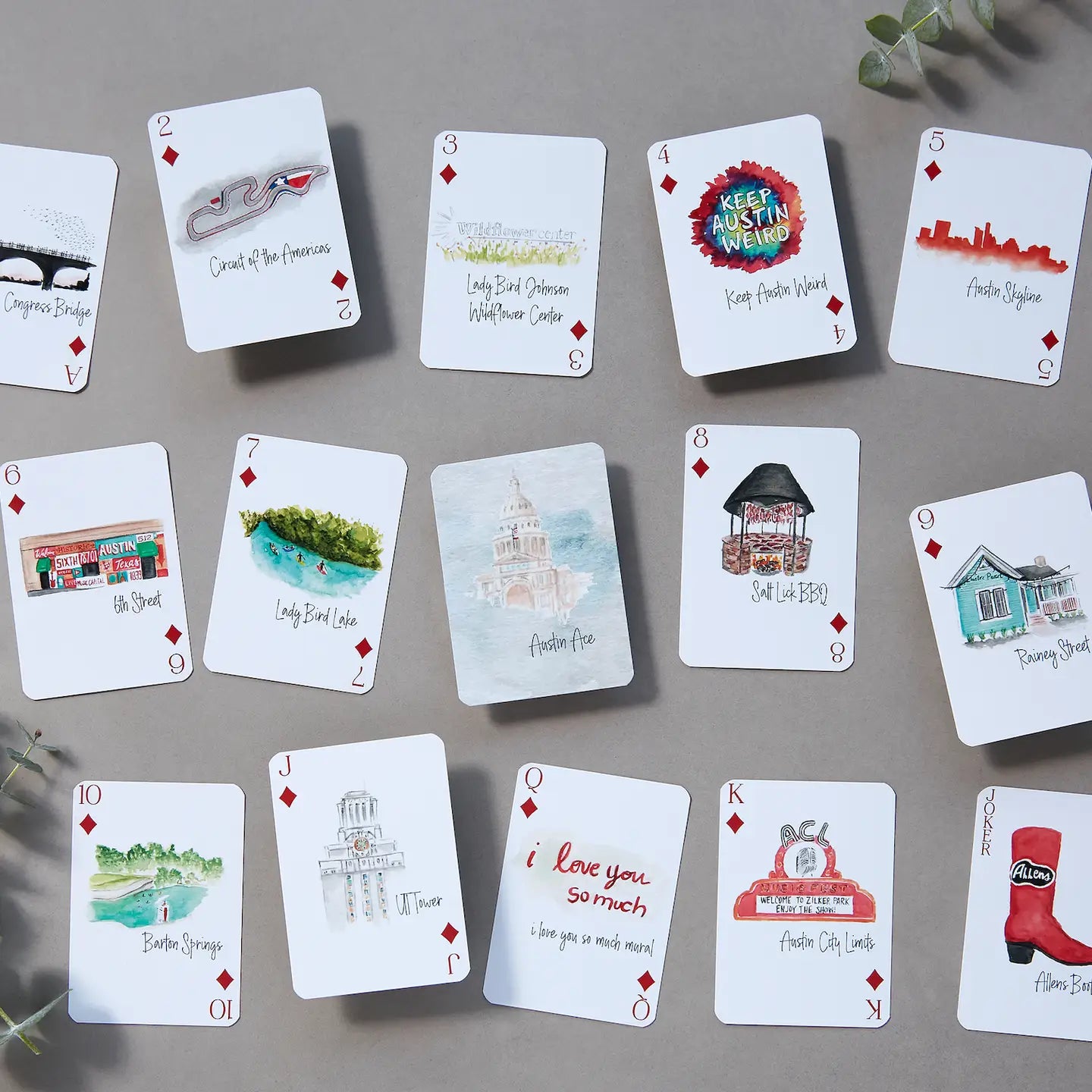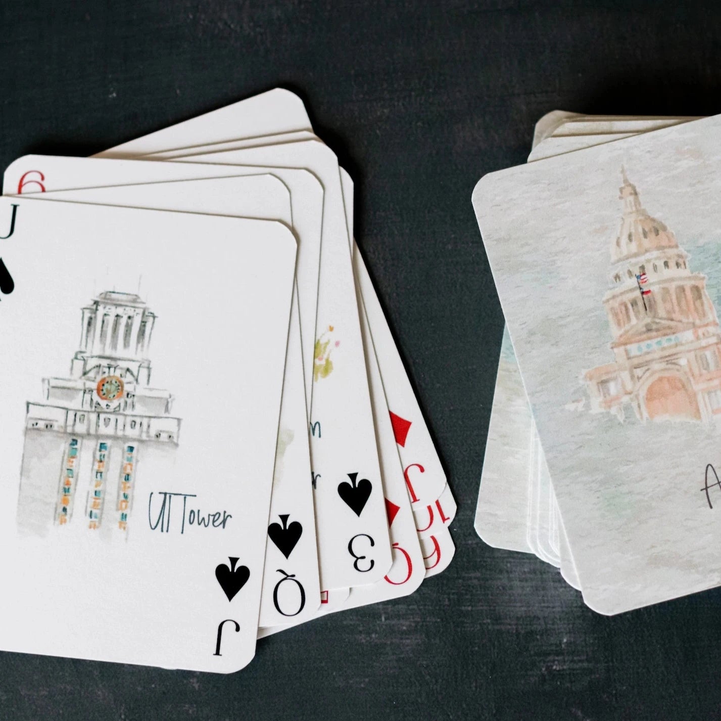 A deck of destinations, every shuffle reveals a new watercolor cityscape. We love these city and state themed watercolor playing cards featuring 15-20 different images representing the heart of your favorite places.