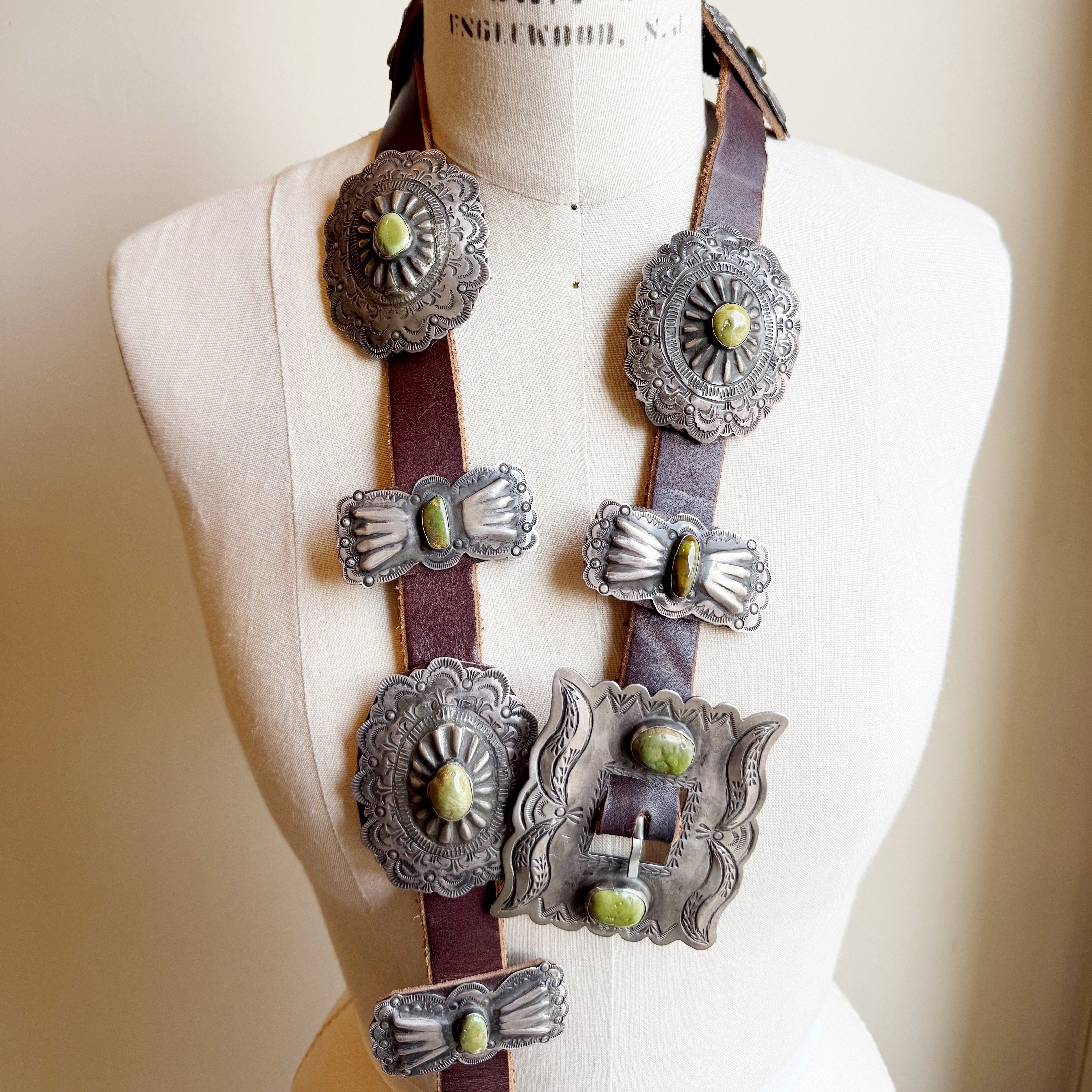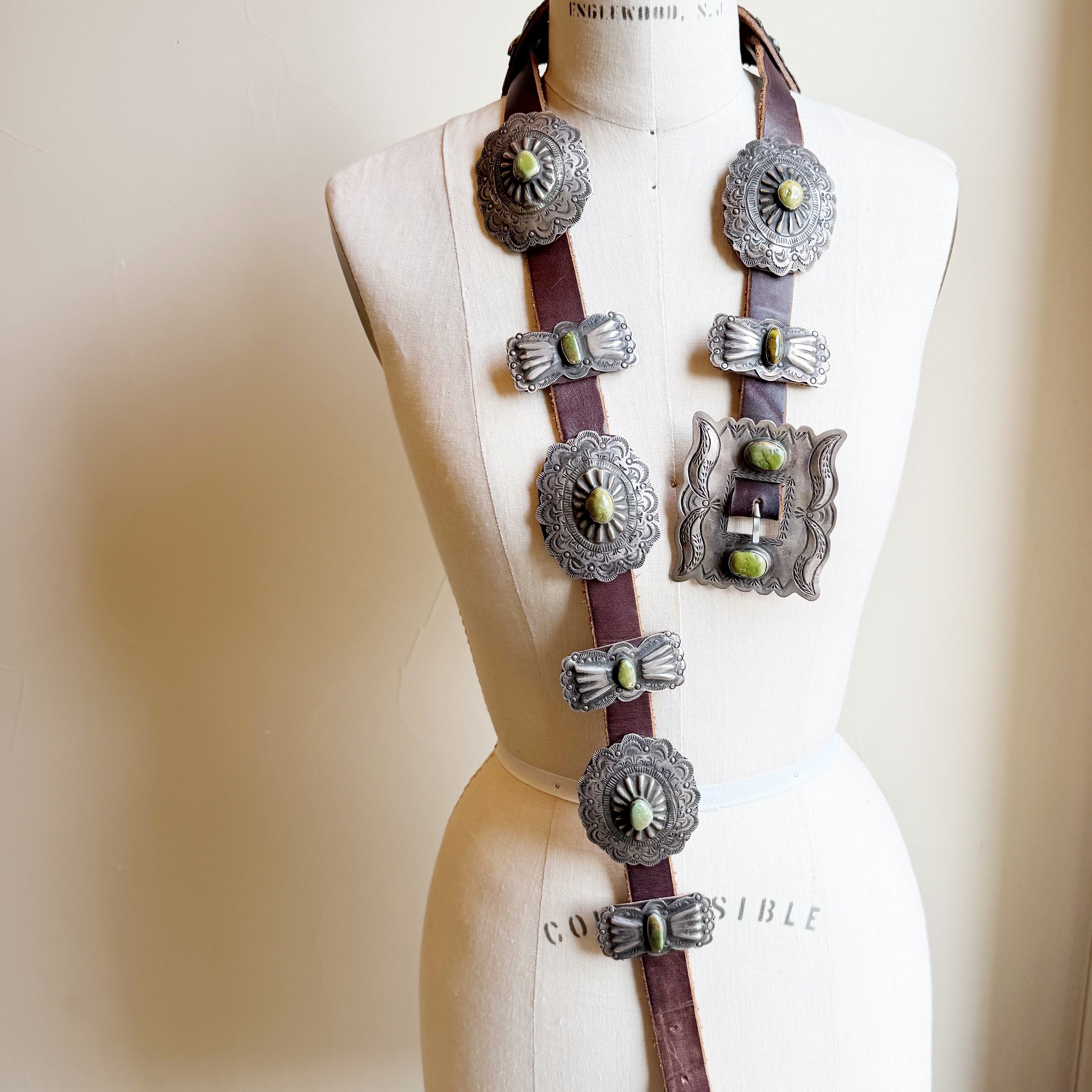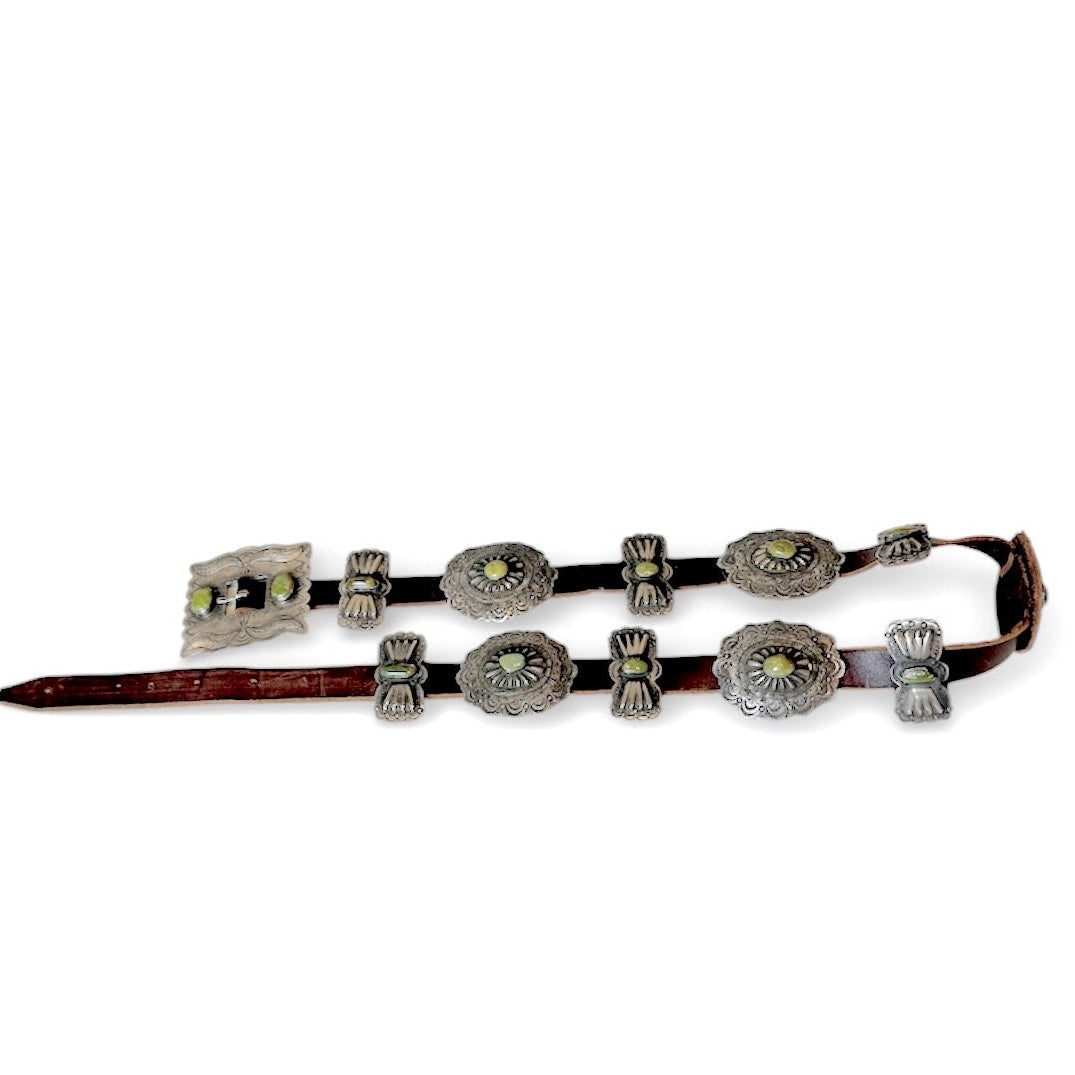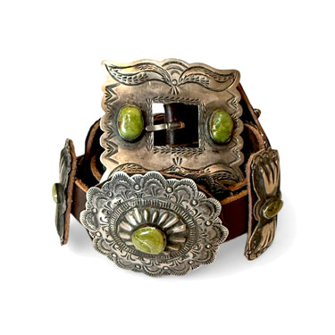 This is a museum quality vintage Navajo turquoise and silver concho belt. This remarkable belt contains a beautiful plethora of hand carved oval and butterfly shaped silver conchos a total of 12 stunning conchos. Each of the larger conchos measure around 3" X 2 1/2" and each of the butterfly shaped conchos measure around 2 1/2" X 1 1/2". Situated in the center of each of the conchos are marvelous large rounded Royston turquoise stones. The surrounding silver works located throughout the entire belt are hand cut and stamped. The impressive large rectangular shaped silver buckle contains two more beautiful turquoise stones and more incredible matching silver works.